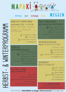 MAPAKI ist ein gemeinnütziger Verein, der für Kinder und ihre Eltern ein grosses Angebot in verschiedensten Bereichen vom Säuglingsalter bis zum Schulkind organisiert und anbietet. Die Angebote umfassen die Organisation von Betreuung, Sportkursen, Spielgruppenangeboten, sowie abwechslungsreiche Freizeitevents, die dem Alter des Kindes und den Bedürfnissen der Eltern angepasst sind. Wir stellen die natürlichen Bedürfnisse des Kindes in allen Bereichen in den Mittelpunkt und pflegen eine gute Zusammenarbeit mit deren Eltern.