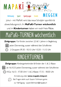 MAPAKI ist ein gemeinnütziger Verein, der für Kinder und ihre Eltern ein grosses Angebot in verschiedensten Bereichen vom Säuglingsalter bis zum Schulkind organisiert und anbietet. Die Angebote umfassen die Organisation von Betreuung, Sportkursen, Spielgruppenangeboten, sowie abwechslungsreiche Freizeitevents, die dem Alter des Kindes und den Bedürfnissen der Eltern angepasst sind. Wir stellen die natürlichen Bedürfnisse des Kindes in allen Bereichen in den Mittelpunkt und pflegen eine gute Zusammenarbeit mit deren Eltern.